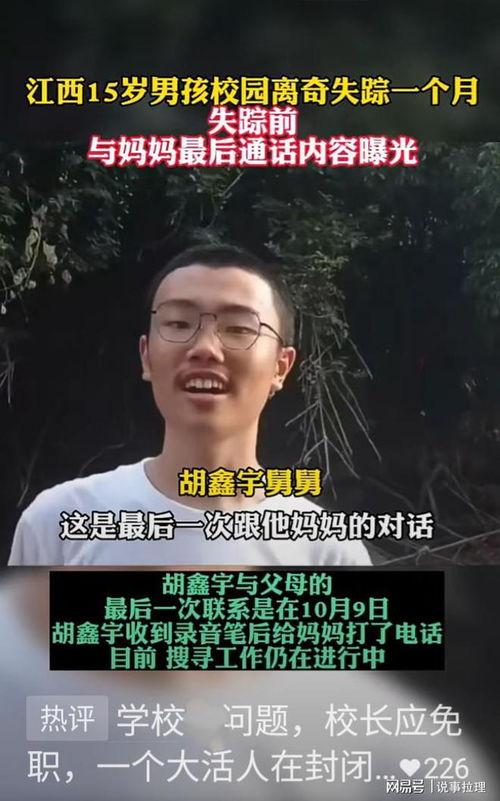 提起胡鑫宇,不得不让人回忆起那起令人痛心的失踪事件。2019年10月,胡鑫宇在江西上饶失踪,经过长达数月的搜寻,最终在2020年1月被发现离世。这起事件引发了广泛关注,也引发了人们对青少年心理健康的关注。